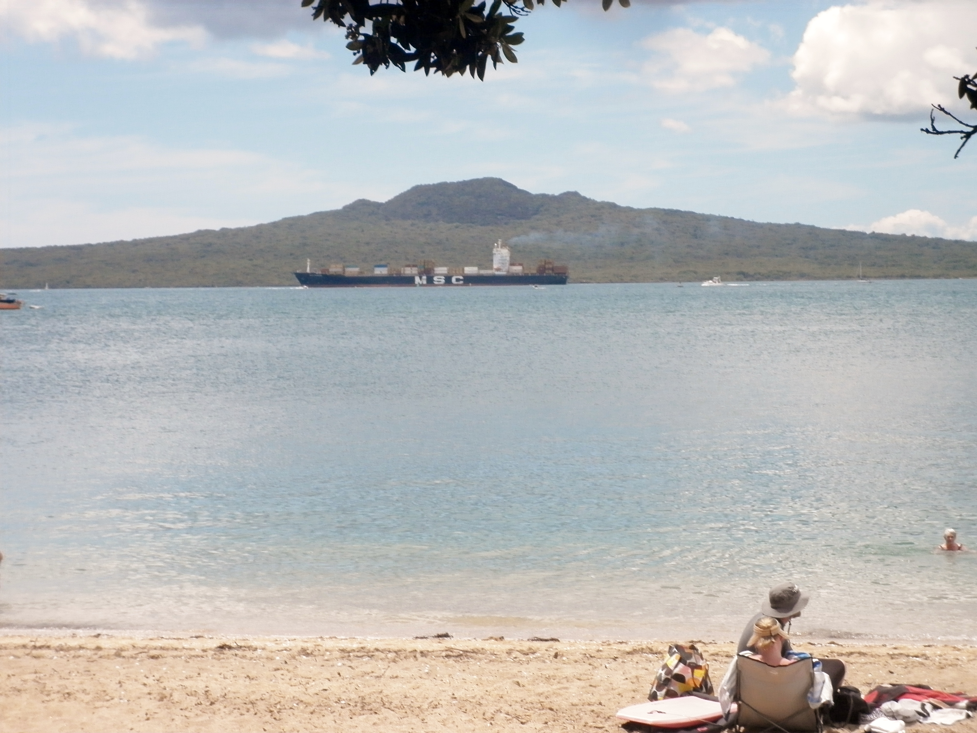 View of Rangitoto Island and the container ship from Cheltenham beach