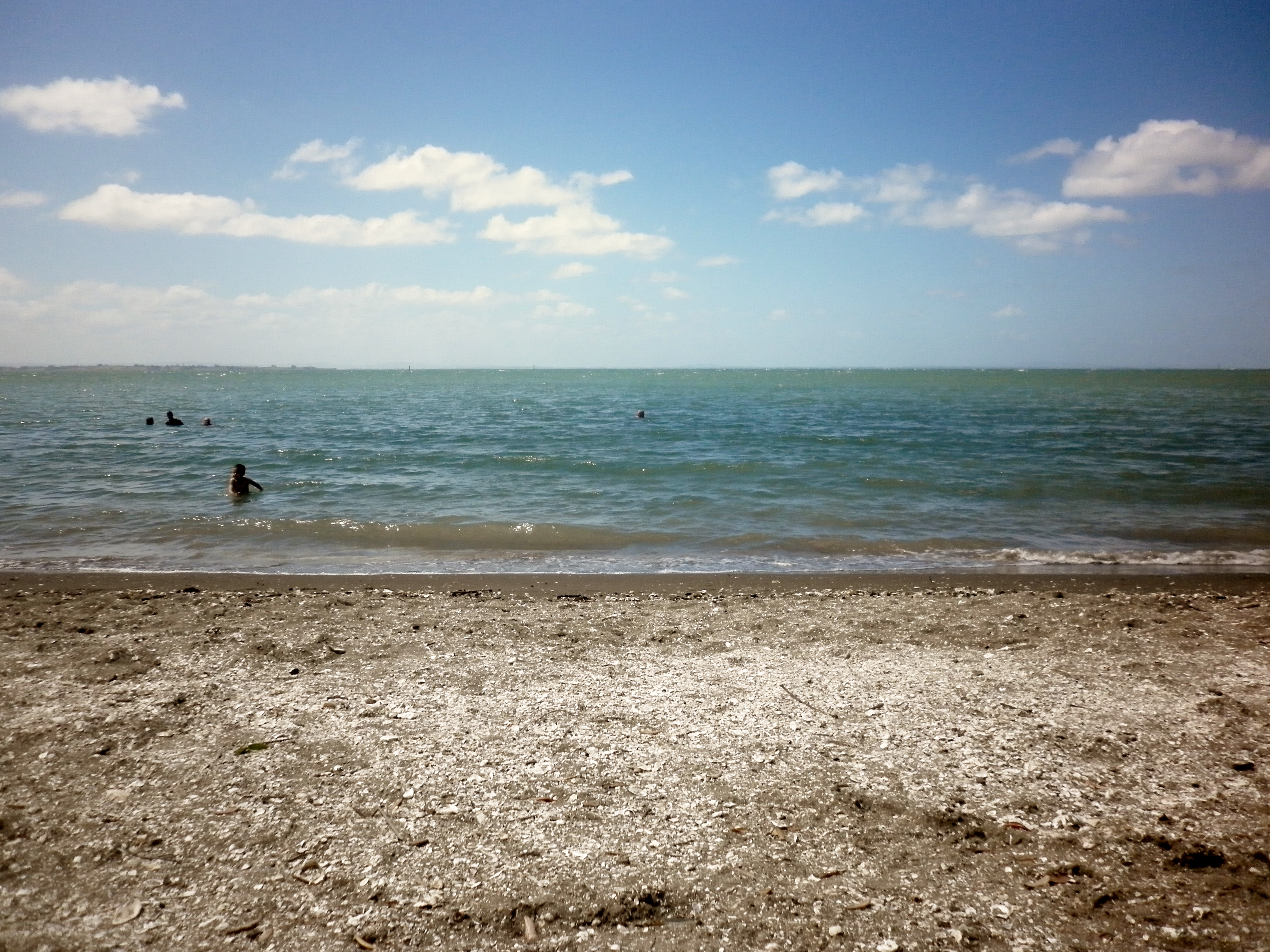 So, I left Green Bay and carried on further west to French Bay. It was about an hour after high tide when I arrived but there was still plenty of water for swimming and quite a few people were taking advantage of the sunny day and doing so, despite a strong westerly wind coming in from Manukau Heads.
