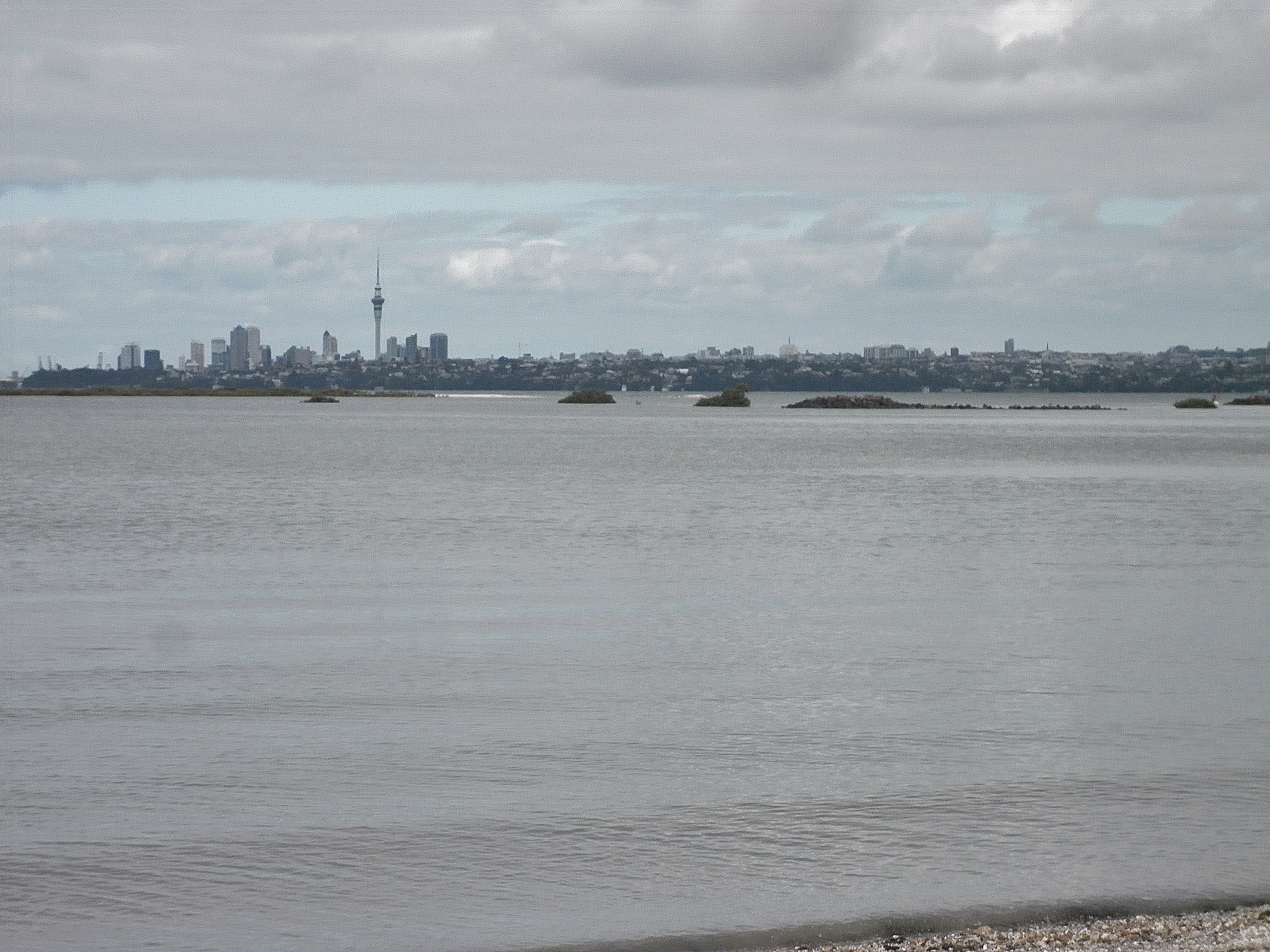 Lacklustre photo of a lacklustre beach with the Auckland CBD in the distance