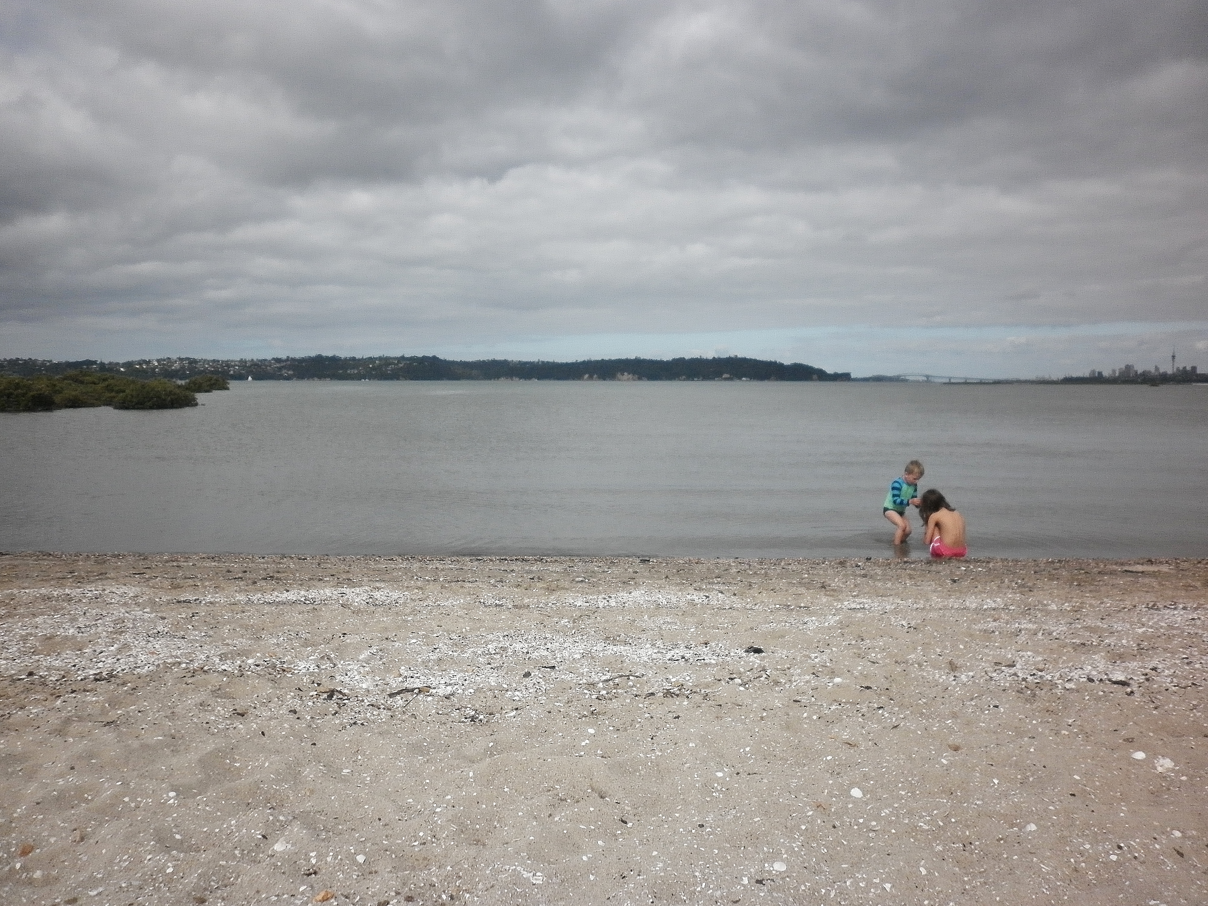 Lacklustre beach on a lacklustre day. A tiny Auckland Harbour bridge is on the horizon towards the right