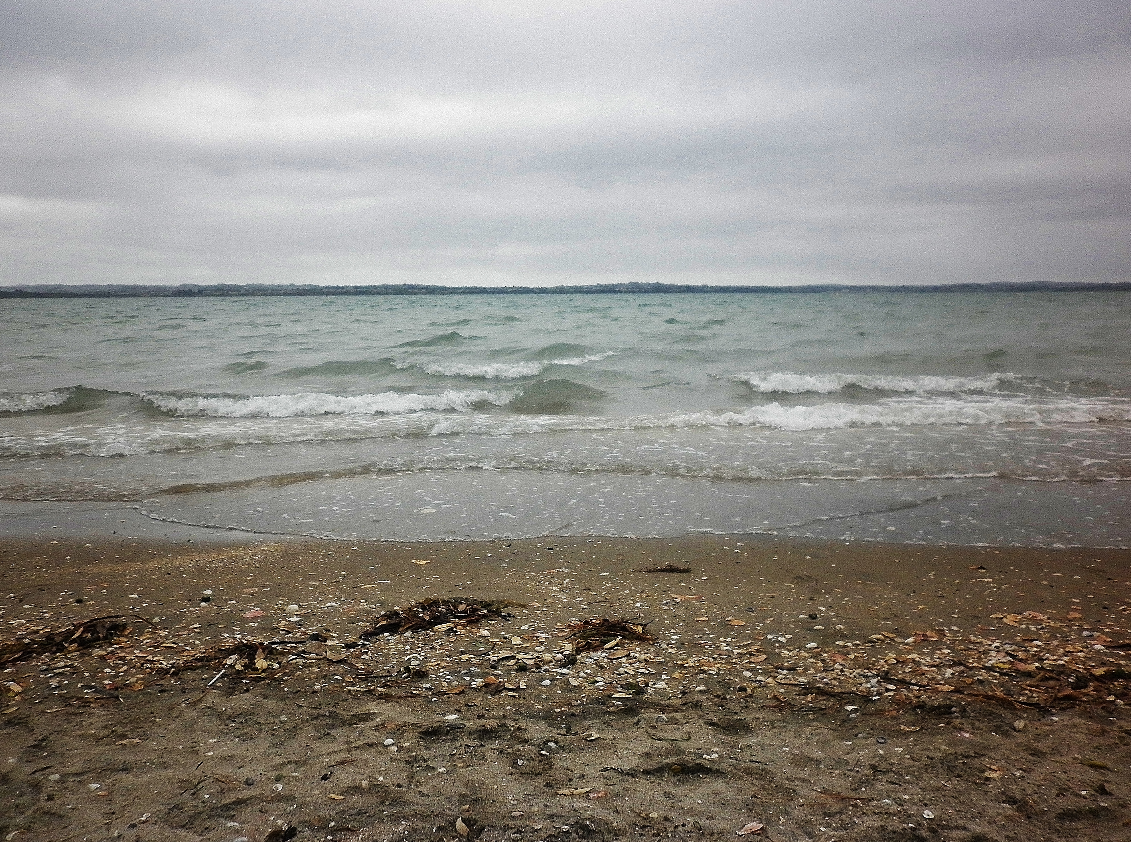 A little bit of surf is up on a windy cloudy day at Pt Chevalier beach