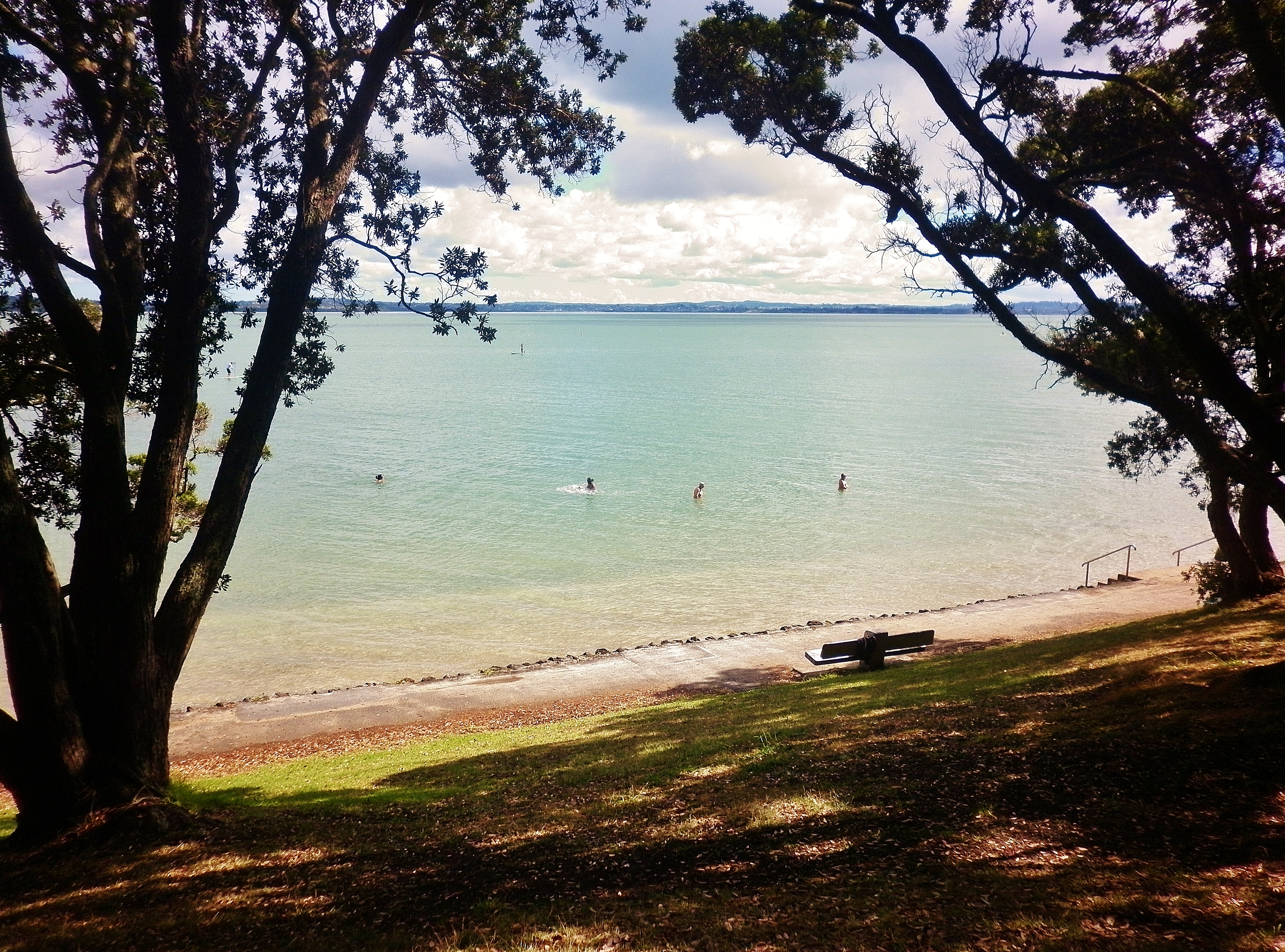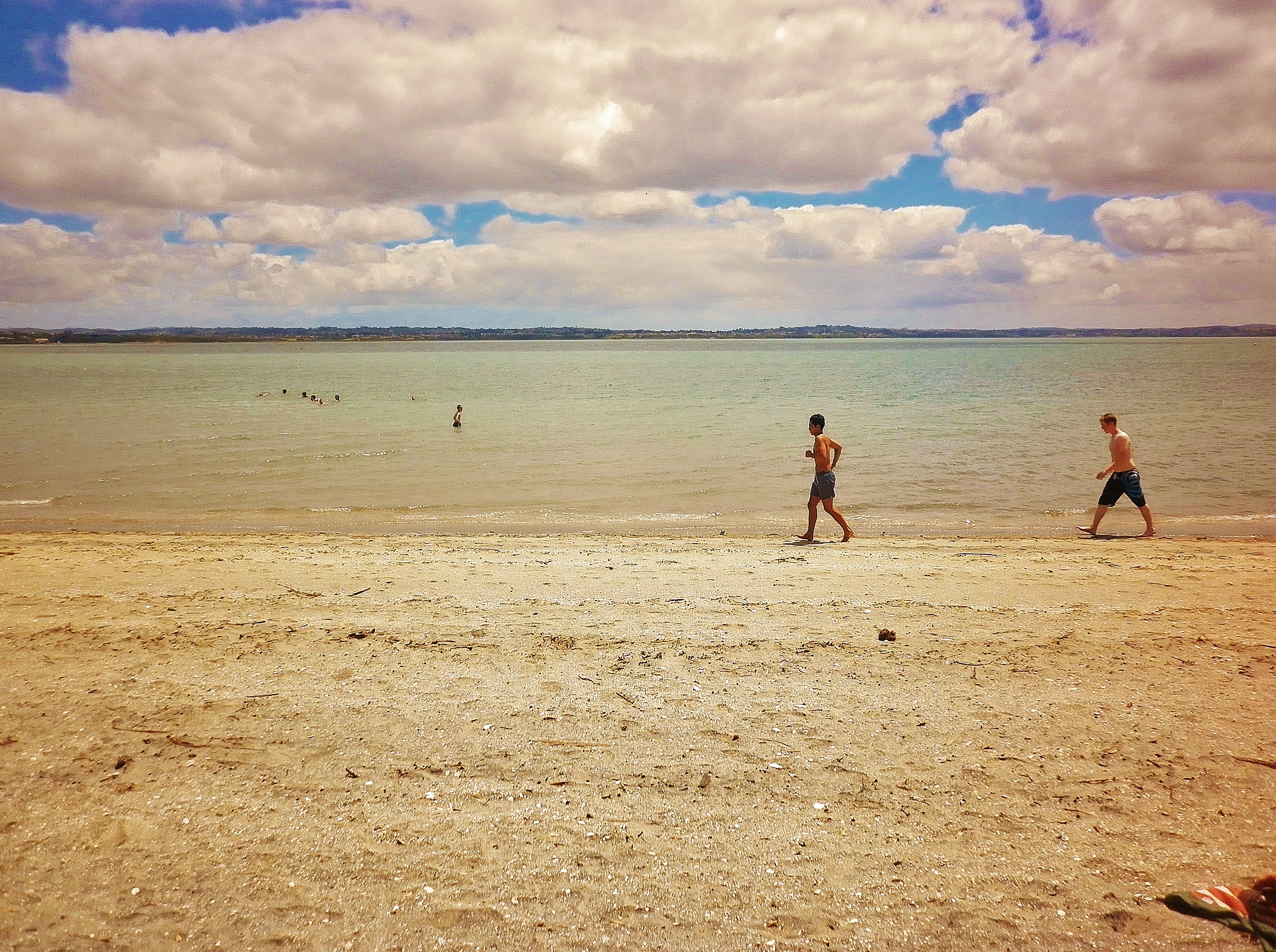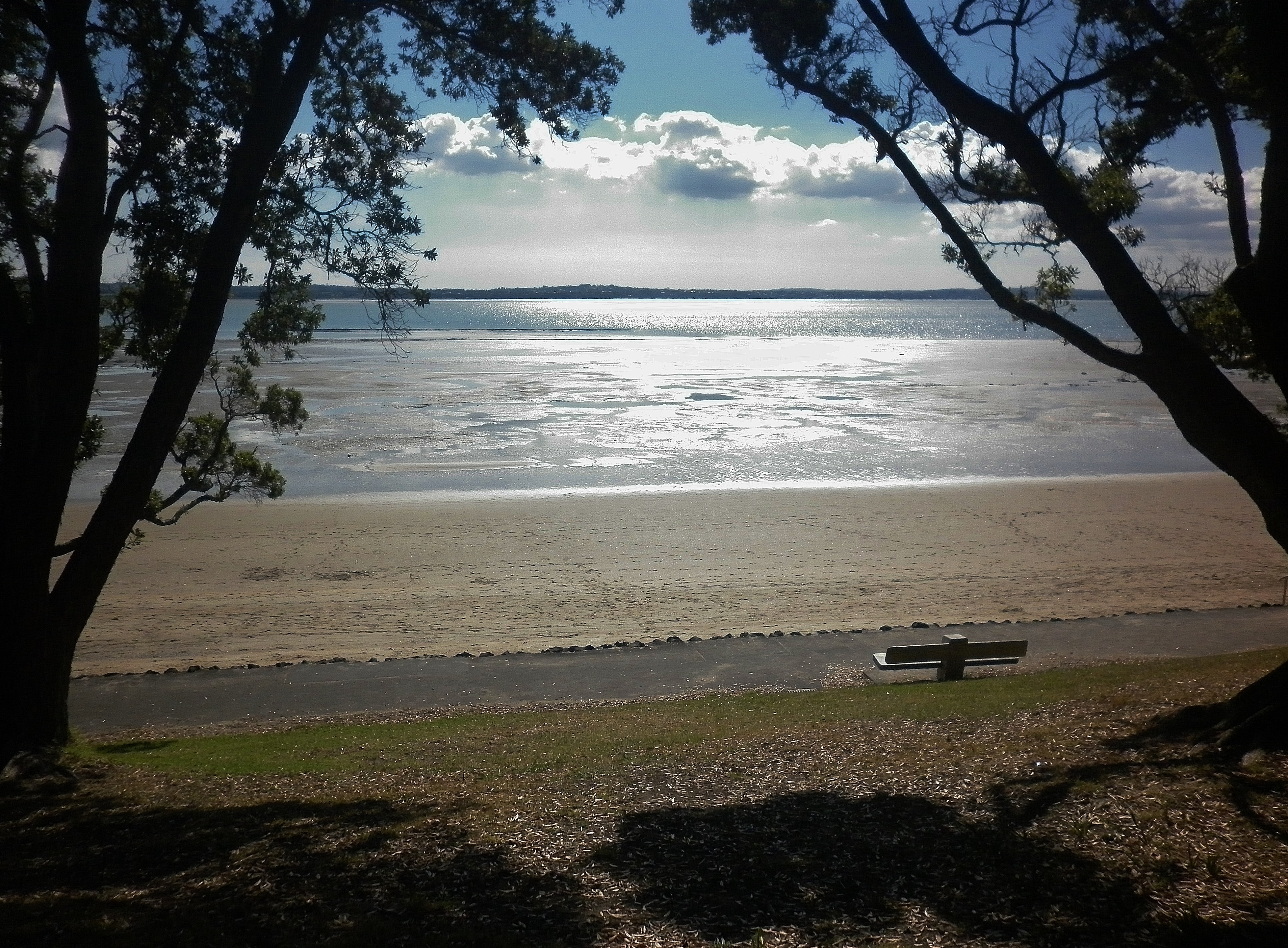 Pt Chevalier beach in autumn 2015. Love the red and white sail on the tiny yacht.