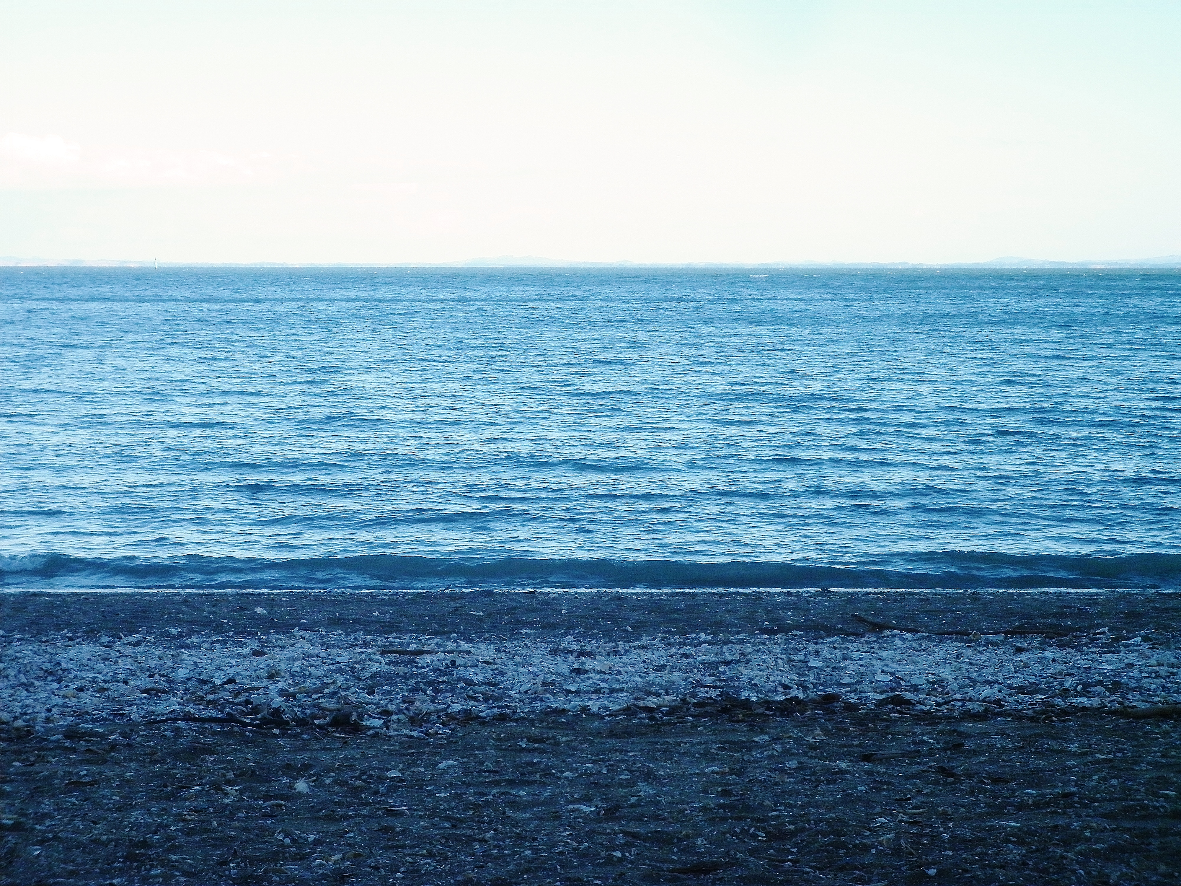 Mid afternoon high tide on a calm day at Point Chevalier beach. Mid síðdegis háflæði á rólegu degi á Point Chevalier ströndinni.